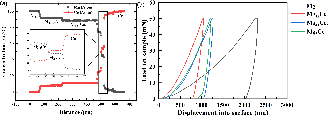 Mg-Ce system annealed at 723 K for 720 h: (a) Element distribution in diffusion region; (b) Displacement-load curve of related phase layer.