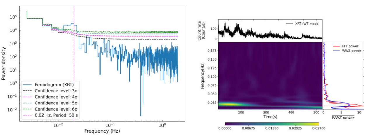 图 1. Swift/XRT光变曲线的周期性分析,左:FFT功率谱和置信程度曲线;右:WWZ动态功率谱。
