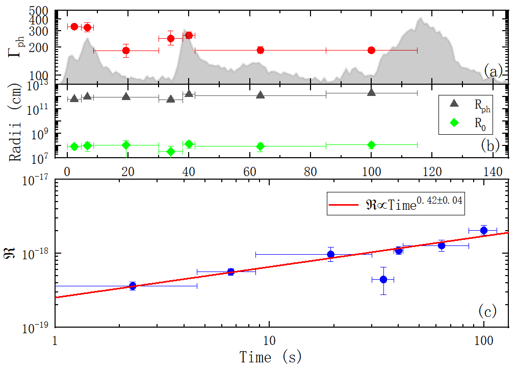 图2. (a)Γph的时间演化。(b) 火球半径(R0和Rph)的时间演化。(c) 推导的 R 随时间的变化关系。