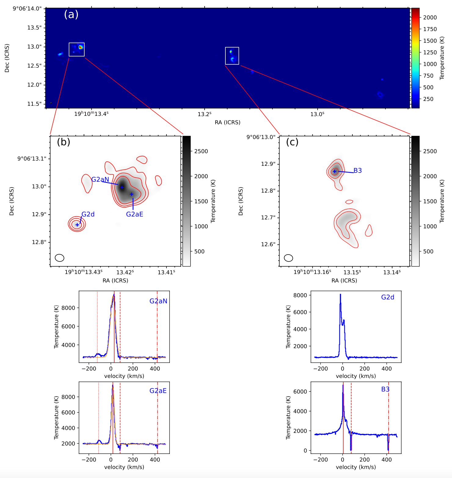 博士研究生路哲与合作者利用高灵敏度、高分辨率的ALMA存档数据,在W49A区域开展了角分辨率达0.03角秒的H29▢射电复合线谱线观测,新发现了4个强H29▢射电复合线脉泽发射源。此前,天体中发现强射电复合线脉泽源的个数仅为个位数,此项发现使其增至10余个,显著扩充了该稀缺样本。